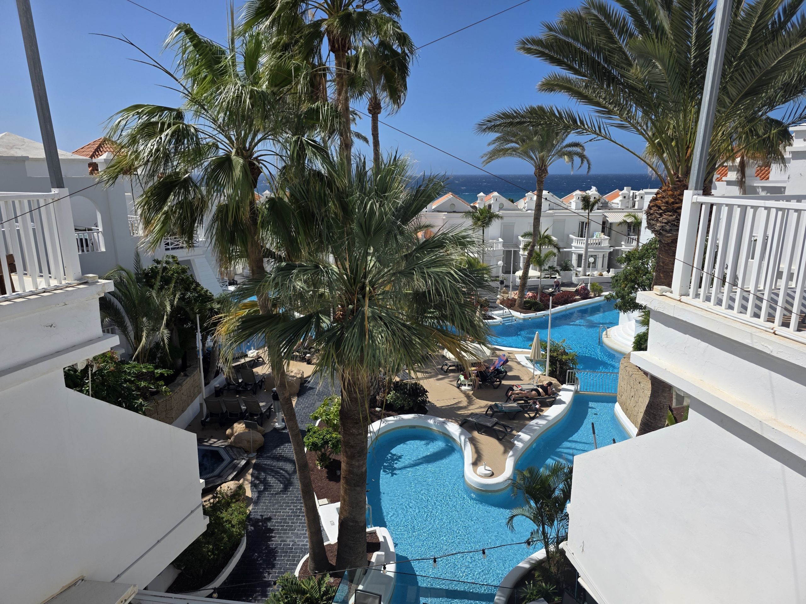 La terraza, equipada con toldo, brinda vistas a una de las piscinas y es el lugar perfecto para relajarte al sol.